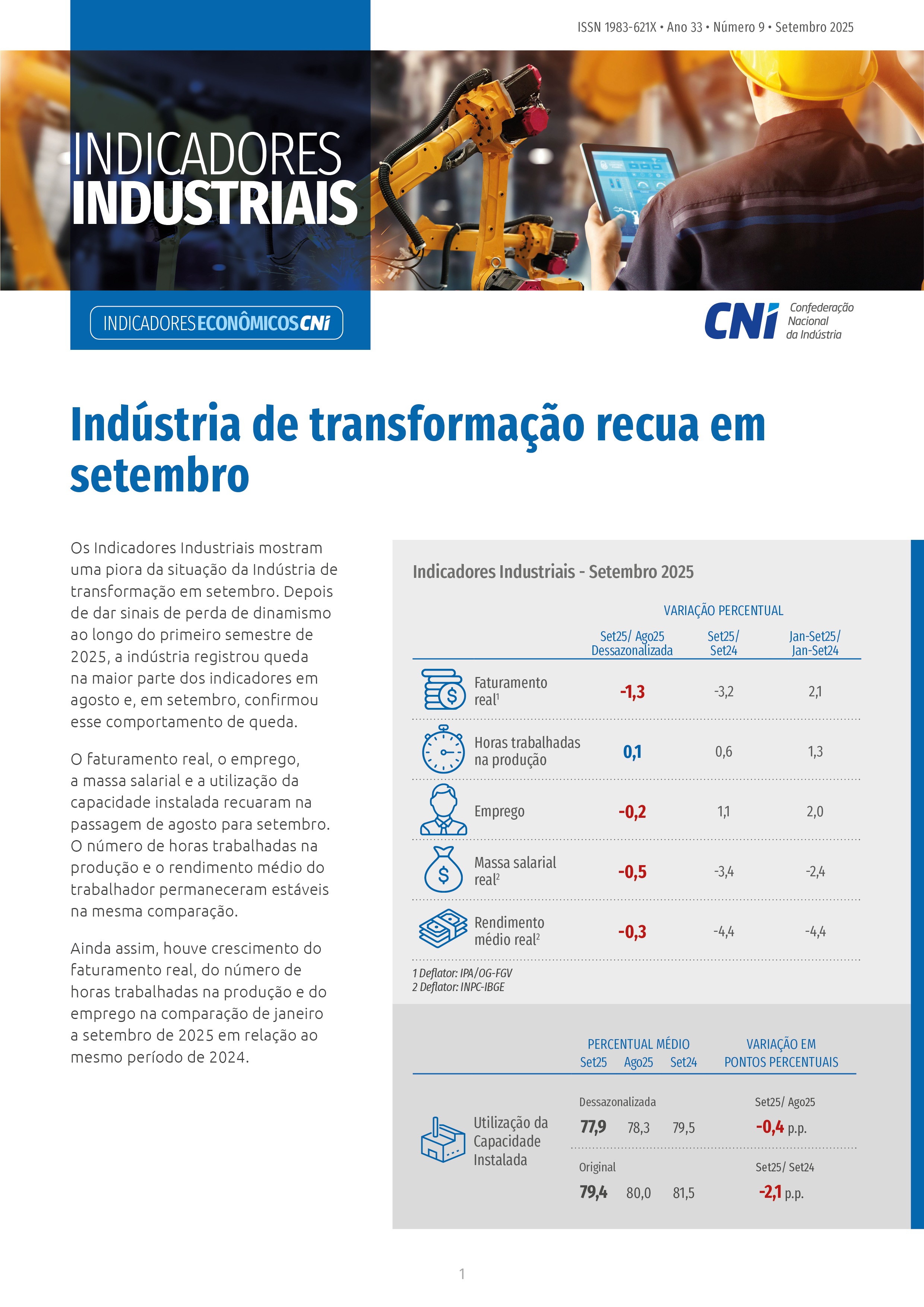 O Índice de Confiança do Empresário Industrial (ICEI) ficou em 47,2 pontos em outubro de 2025, após alta de 1,0 ponto frente o mês anterior. Mesmo com a alta, o ICEI completou dez meses consecutivos de falta de confiança – valores abaixo de 50 pontos mostram falta de confiança. Com a alta do ICEI, a percepção de falta de confiança persiste, mas se tornou mais moderada.